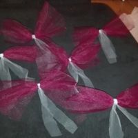 Meninas, devido a minha falta de jeito para estas coisas, estes são os primeiros laços para os carros de convidados que fiz. O tule é horrivel de cortar, fica todo torto (como se pode ver nas fitas...