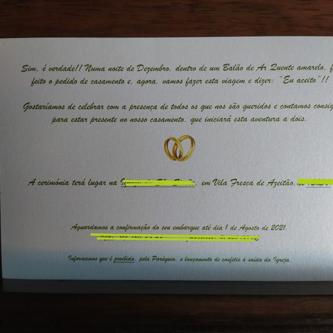 Boa noites a todas/todos. Este debate é para vos mostrar o resultado da nossa elaboração dos nossos convites de casamento. Para recordar, o nosso tema é o balão de ar quente amarelo onde fui pedida em casamento. Assim, a nossa cor principal é o verde...