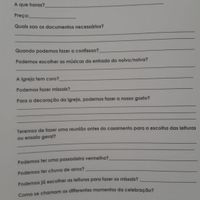 Há 3575 diasOlá noivinhas, Achei que era importante colocar por escrito as minha perguntas igualmente para o padre em agosto. Aqui vão elas. Pode ser que ajude algumas de vocês. Bons preparativos meninas