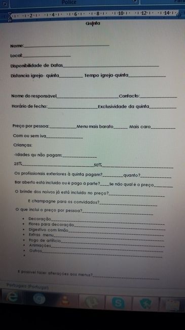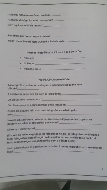 Olá noivinhas, Segundo uma boa pesquisa entre os debates de outras meninas, fiz o meu questionnário. Então decidi colocá-lo aqui. Pode ser que ajude algumas de vocês. Bons preparativos meninas Perguntas fotógrafos - 1 Perguntas fotógrafos - 2...