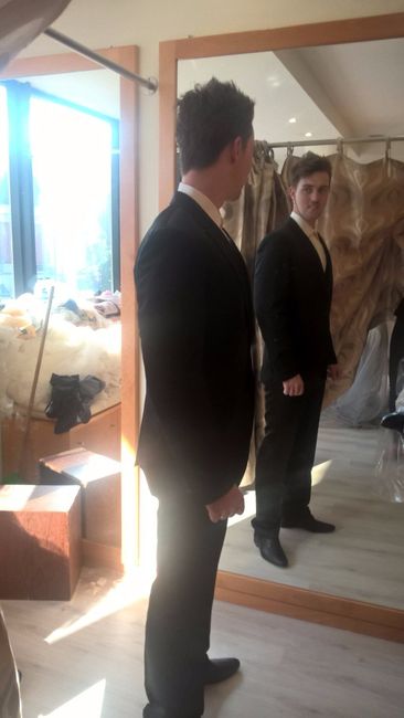 Minhas queridas! Foram feitos os ultimos ajustes no fato do noivo e ficou... perfeito! Falta, claro, o papillon e o lenço para o bolsinho que a senhora vai fazer na próxima semana, mas de resto está perfeito. Acho qe no grande dia não é o noivo que...