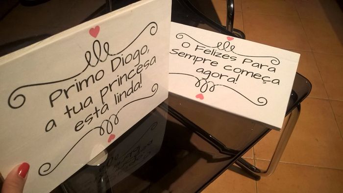 Minhas queridas Finalmente acabei as plaquinhas dos meninos: Era para ser uma para ambos seguraram mas, acabámos por optar por duas mais pequenas, uma para cada um. O noivinho escolheu as frases e eu fiz o design. Até que gosto do...