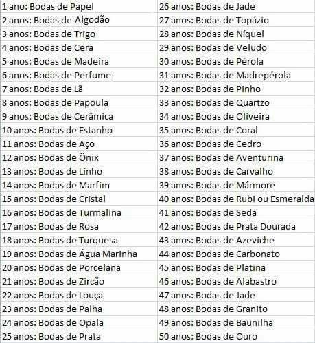 Bom dia brides , as q casam hj que tenham um dia super maravilhoso e aproveitem ao maximo ! Vi está foto e achei super interessante como há nome de boda para cada ano q passa Um dia super feliz , beijinho