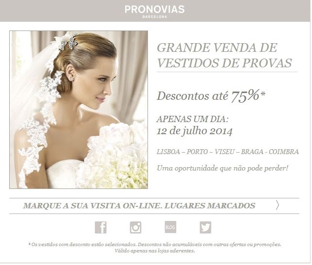 Meninas, quem quiser aproveitar http://www.pronovias.pt/eventos-na-loja/samplesale-pt-120762014/?utm_source=NL-OC-PT&utm_medium=correo%20electronico&utm_campaign=Sample-Sale-PT