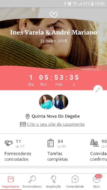 Olá Comunidade Entre a organização do casamento, as ideias que vemos na app, os fornecedores que contratamos...o tempo passa a voar, né? Como vão os vossos contadores? Partilha uma foto! 🗓️