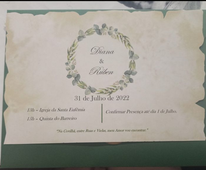 Bom dia comunidade linda 🙂 Feliz ano novo para todos(as)! Hoje venho mostrar-vos os meus adorados convites 🙂 Foram feitos pela minha irmã, no canva. Estão muito simples, mas para mim e para o meu noivo estão lindíssimos. Encomendámos envelopes pelo...