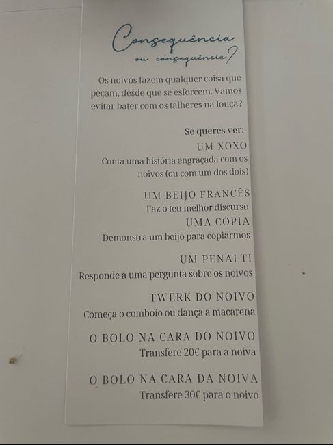 Olá noivas! Hoje trago-vos o que fizemos para identificar os lugares dos convidados. Em vez do típico menu decidimos ter jogos 🫶🏻 Ora vejam: Temos pinturas para as poucas crianças, um jogo de desafios (segunda foto) e bingo (também fizemos uma versão...