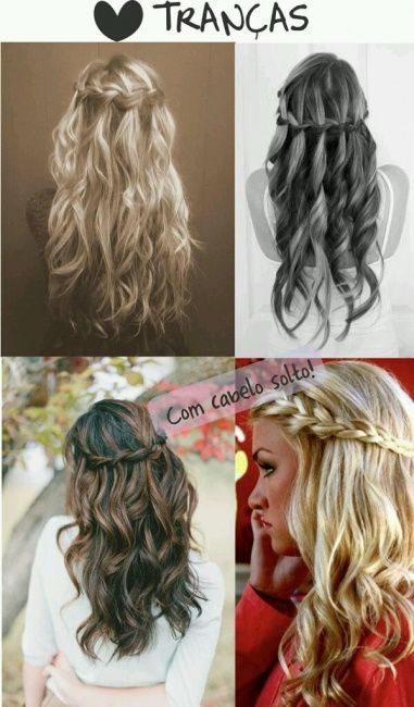 Olá meninas/os Estou bastante indecisa no meu penteado :/ Inicialmente queria o cabelo ondulado e com esta trança em cascata. Mas agora acho que o cabelo esticado fica simples e bonito. Visto que o vestido já é volumoso e que eu sou "pequenita"...