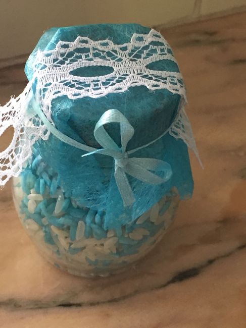 Tal como já tinha prometido na última publicação aqui estão os frasquinhos com o arroz! Utilizei azul e branco por serem as nossas cores! Com o pormenor da renda dos convites! Pelo menos já está. Menos uma preocupação ????