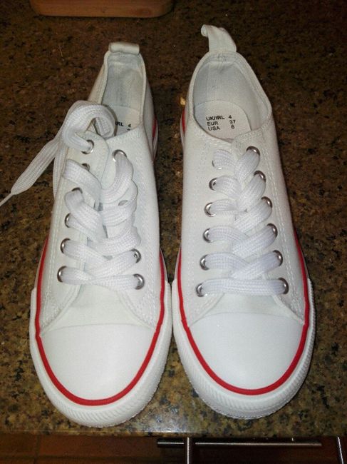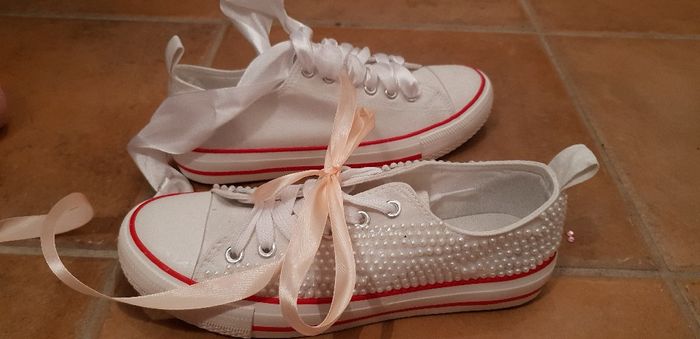Olá meninas Depois de um dia de trabalho cansativo, nada melhor que trabalhos anuais 😉 Ainda falta o colar no outro tenis Agora a duvida pernamece o atacador branco ou salmão? Preciso da vossa opniao
