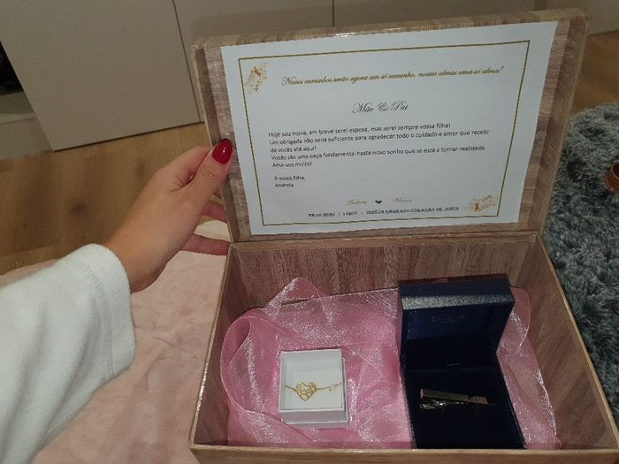 Para o convite dos pais outra "dor de cabeça", mas acabei por me decidir e ficou parecido com o dos meus padrinhos, um pulseira gravada para a mãe e um "pin" gravado para a gravata do pai. Uma caixinha com um texto fofinho e está feito Espero que...