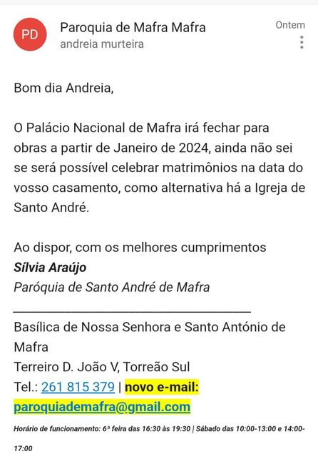 Queridas noivas, Com imensa pena que recebi a confirmação que a basilica de mafra vai mesmo entrar em obras em janeiro de 2024 e fechar!!! Que a informação chegue a todas as noivas que, como eu,iriam la casar!!!Beijinhos*