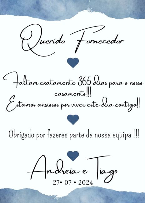 Queridas noiva, Daqui a 1 ano é o meu casamento!!! Hoje enviei aos fornecedores este miminho!! Como assim 1 ano!!!??? Ainda ontem faltava quase 2 anos!!! E Ainda tenho tanto para fazer!!!! Deixo a lista do que esta feito ou em andamento...[ ] Quinta...